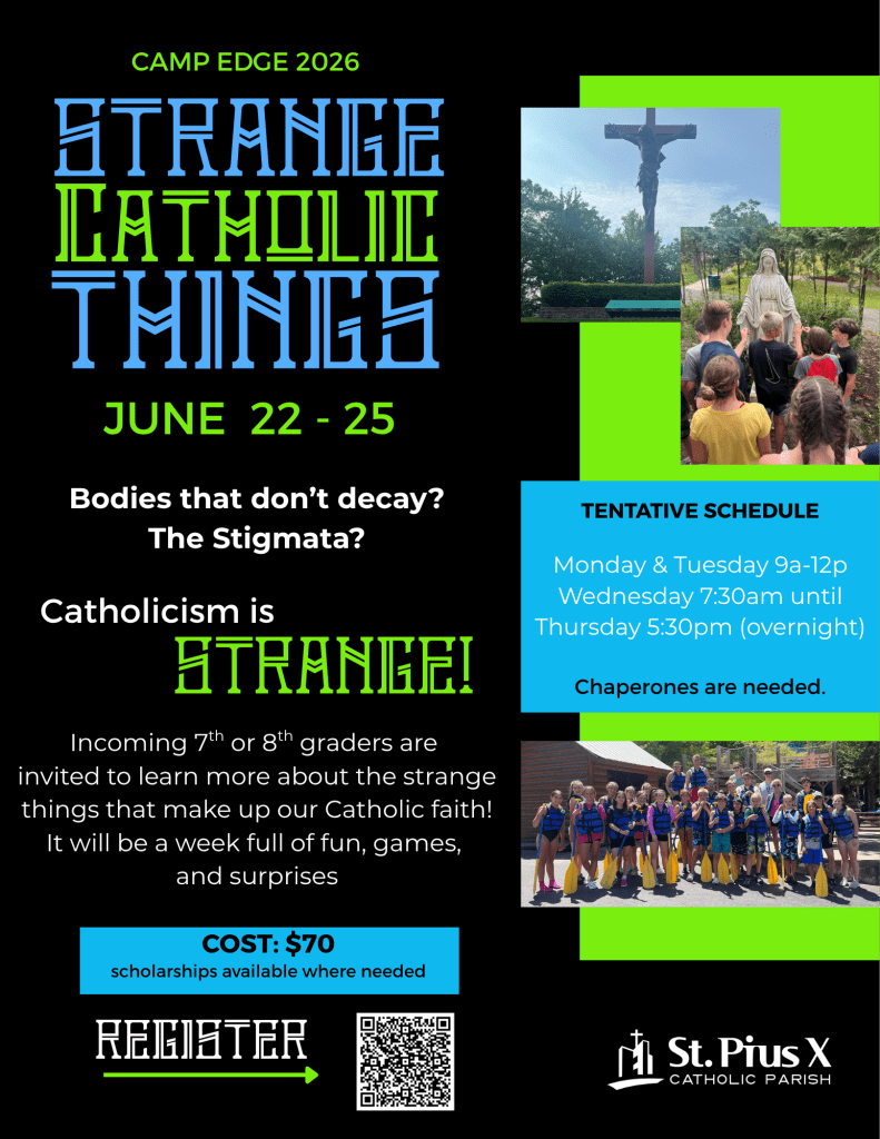 A cross between Vacation Bible School and Catholic Heart Work Camp, this summer camp is for Middle Schoolers only! CAMP EDGE is a week-long adventure that will involve energetic (and sometimes messy) games, delicious treats, & crazy overnight adventures; all the while learning about some very important aspects of our Catholic Faith. The only complaint received has been that the camp is Too Short!
