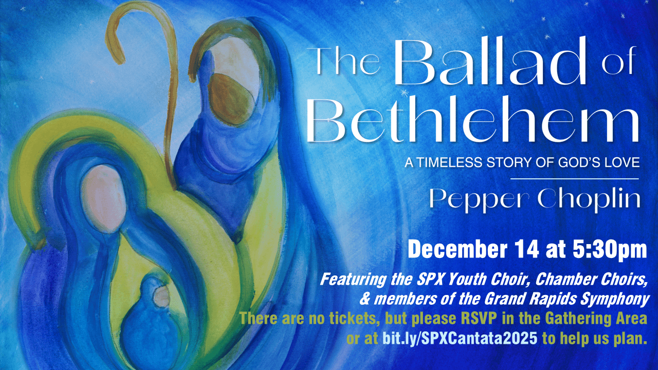 Please join us on December 14 at 5:30pm in the Sanctuary for an Advent Cantata. The SPX Youth Choir, Chamber Choirs, and members of the Grand Rapids Symphony will present The Ballad of Bethlehem: A Timeless Story of God’s Love by Pepper Choplin.